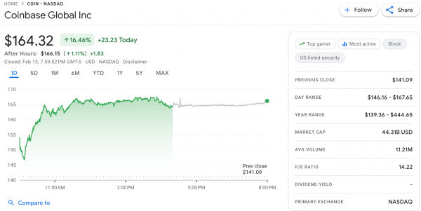 13 февраля акции под тикером COIN выросли более чем на 16%, до $164. Источник: Google Finance.