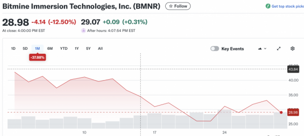 У компаний, занимающихся казначейством Ethereum, ситуация та же. За последний месяц акции Bitmine Immersion Technologies (BMNR) упали более чем на 37,8%, а Sharplink Gaming (SBET) – примерно на 30%.