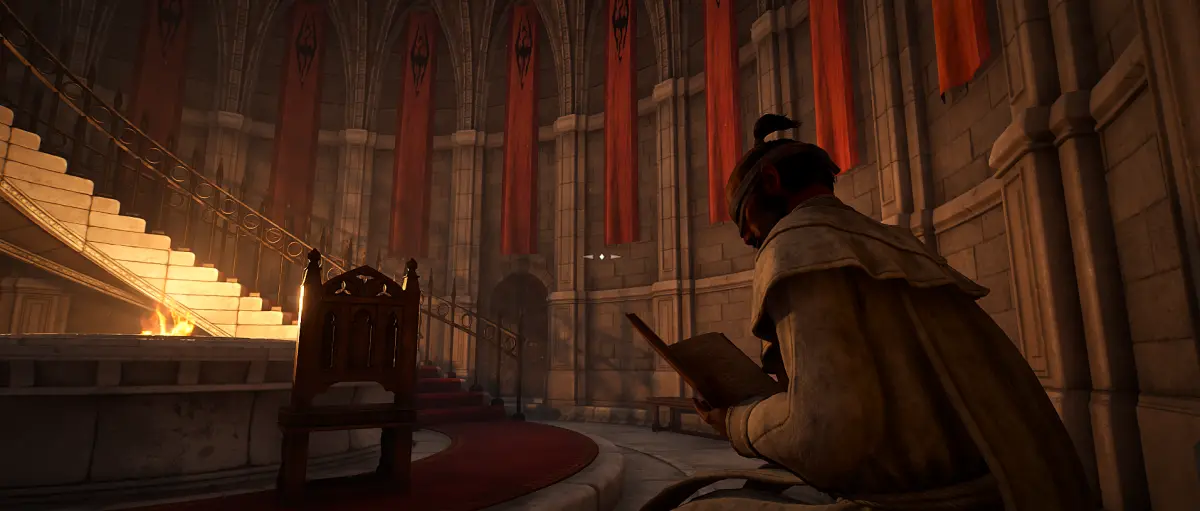Нажав на рычаг следуйте в левую часть коридора, где будет находиться дверь читального зала. Войдите внутрь и сядьте на стул. Серый Лис заранее все организовал и жрецы вынесут вам Древний свиток, приняв вас за Селию Каморан.
