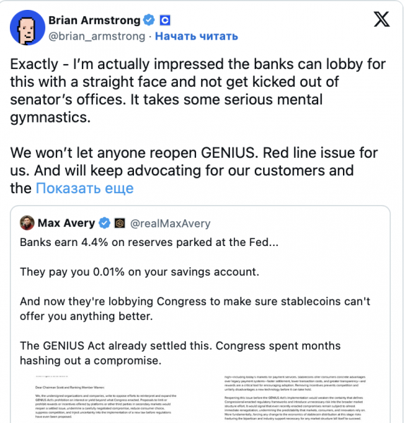 Ранее коалиция из 125 криптокомпаний, включая Coinbase, направила письмо в Банковский комитет Сената. Участники рынка выступили против любых пересмотров законодательства. По их мнению, возобновление обсуждения подорвет регуляторную определенность.