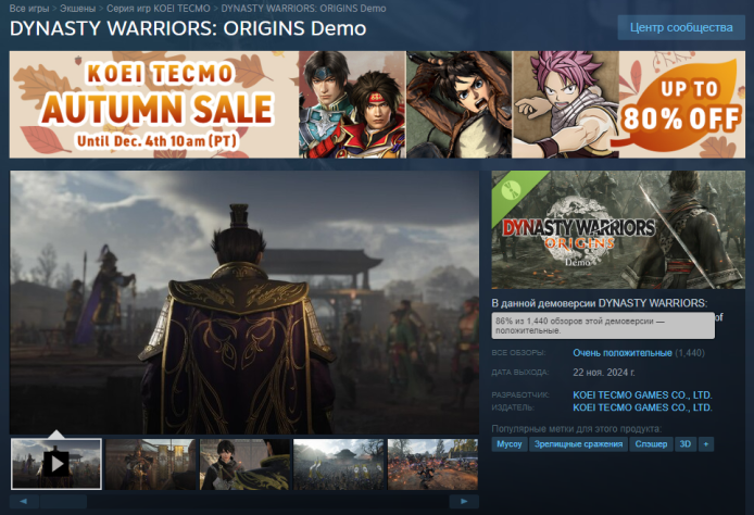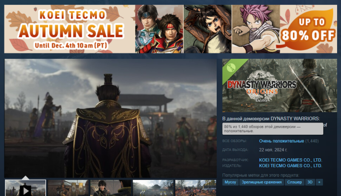 На днях студия Koei Tecmo Games выпустила обещанную демоверсию Dynasty Warriors: Origins. Бесплатный пробник доступен для ознакомления на всех целевых платформах, а именно ПК, PlayStation 5 и Xbox Series. За два дня «демка» сумела собрать почти полторы тысячи «очень положительных» отзывов в Steam — 86 %.
