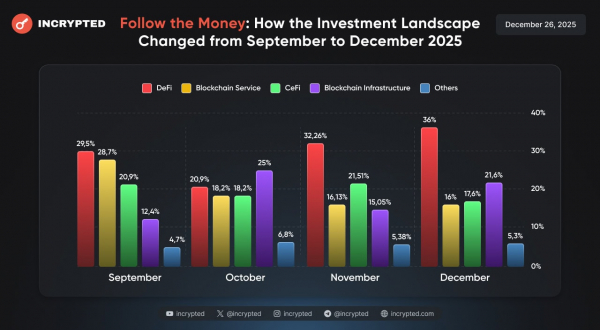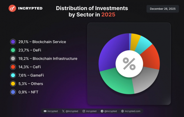 В 2025 году в фокусе инвесторов были преимущественно такие сектора, как блокчейн-сервисы и DeFi. На третьем месте — инфраструктурные решения. Категория NFT, на которую в 2024 и 2023 годах приходилось 2,3% и 7,1% соответственно, занимает долю всего в 0,94%.