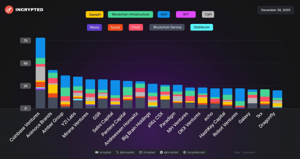 Согласно CryptoRank, самым активным инвестором в 2025 году стала компания Coinbase Ventures, венчурное подразделение одноименной криптобиржи, — более 75 раундов. В топ-5 входят также: Animoca Brands, Amber Group, YZi Labs и GSR.