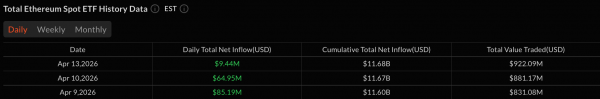 Эти потери были компенсированы стабильным притоком средств в другие продукты. ETHB от Blackrock привлек 5,78 млн долларов, Ether Mini Trust от Grayscale — 5,15 млн долларов, а FETH от Fidelity — 3,93 млн долларов. Объем торгов составил 831,08 млн долларов, а чистые активы на конец дня — 12,98 млрд долларов.
