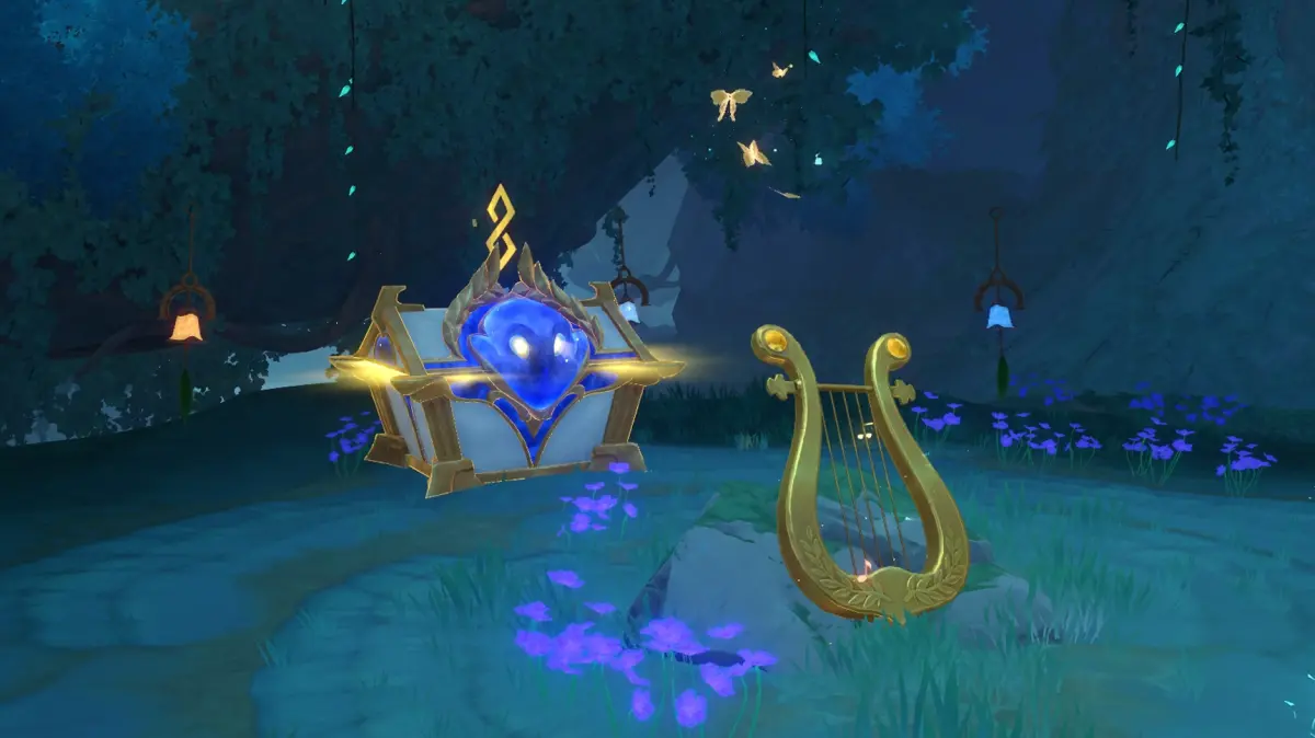 После воспроизведения мелодии появится роскошный сундучок, при открытии которого будет выдано достижение «Жужжащие секреты: Древний трезвон колокольчиков» (+5 нефритов из набора «Постичь непостижимое»). Из этого ларца вы также получите: