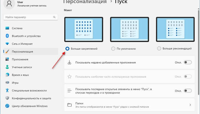 В Windows 11 можно изменить макет меню «Пуск», чтобы более правильно распределить место между разделами по умолчанию. В настройках персонализации системы можно выбрать подходящий дизайн, например, «Больше закреплений», чтобы иметь в меню «Пуск» больше места для закрепленных приложений.