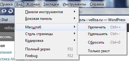 В браузере Mozilla Firefox необходимо будет нажать на кнопку «Firefox» => «Настройки». Затем следует установить флажок напротив пункта «Панель меню». После появления в главном окне браузера «Панели меню» (как в прежних версиях браузера Mozilla Firefox), «Вид» => «Масштаб».