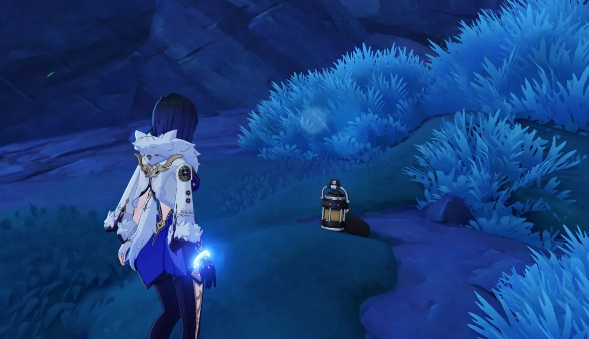 Переместитесь к телепорту «Пустынный коридор» на севере острова Лемпо, а затем начните идти на восток, поднимаясь на верхушку холма. Здесь на камне вы увидите светящуюся голубым светом лампу. Рядом могут быть фатуи, так что действуйте осторожно.