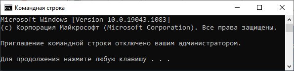 В результате на экране ПК после запуска командной строки с обычными или администраторскими правами появляется сообщение: «Приглашение командной строки отключено вашим администратором».