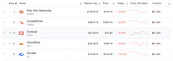 Курс акций компаний по кибербезопасности. Источник: CompaniesMarketCap