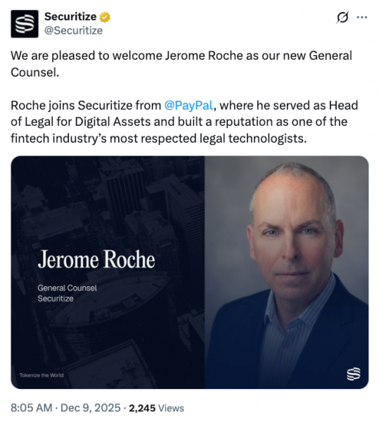 Крупная платформа для токенизации Securitize удвоила усилия по привлечению американских инвесторов к токенизированным акциям и назначила бывшего руководителя PayPal своим новым главным юрисконсультом.