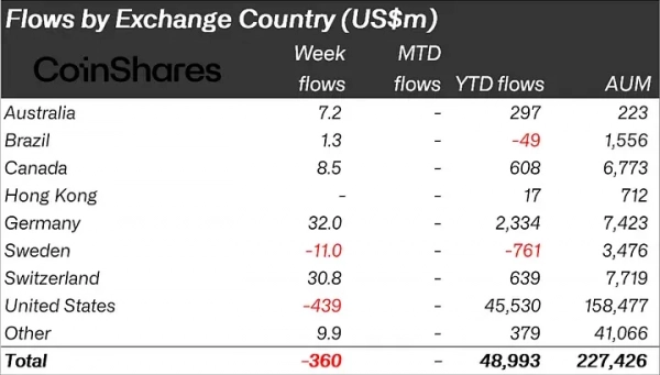 В региональном плане негативные настроения инвесторов больше всего затронули США, где недельный отток из криптофондов достиг $439 млн. Совокупные потери частично компенсировали поступления в продукты, зарегистрированные в Германии и Швейцарии в размере $32 млн и $30,8 млн соответственно.