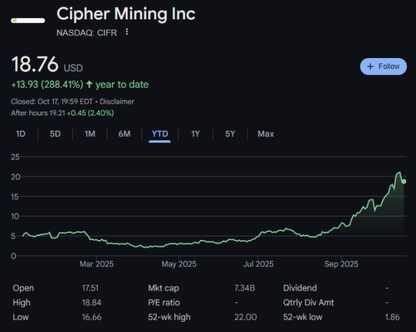 Динамика акций Cipher Mining с начала года. Источник: Google Finance.