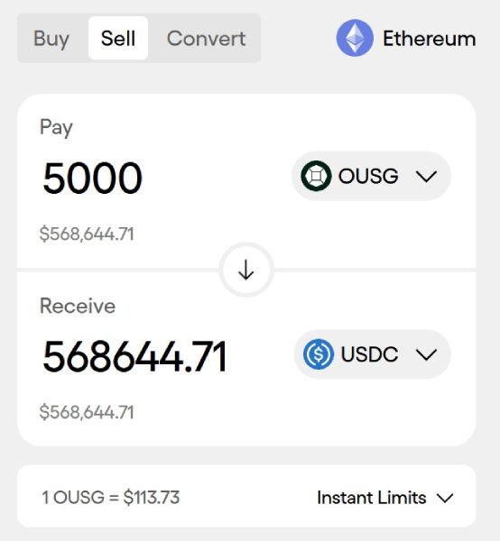ТДФ можно конвертировать в фиатную валюту или стейблкоины на сайтах эмитентов. В отличие от паёв обычных денежных фондов, токены выкупают круглые сутки без выходных. Сделки обрабатывают практически мгновенно и удерживают небольшую комиссию величиной 0,03% или ещё меньше. Для того, чтобы обменять, например, OUSG, необходимо:
