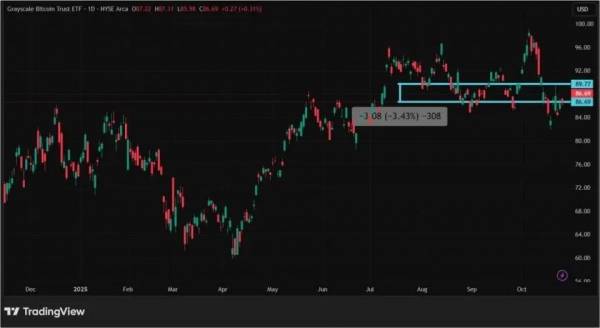 На пятом месте расположился спотовый ETF на биткоин от компании Grayscale — Grayscale Bitcoin Trust с капитализацией $60,02 млрд. В октябре 2025 года его акции/паи снизились в цене на 3,43%. Основная причина — падение стоимости BTC из-за возможного введения пошлин на китайский импорт. В самом же GBTC продолжается фиксация оттока денежных средств — в октябре он составил $478,44 млн.