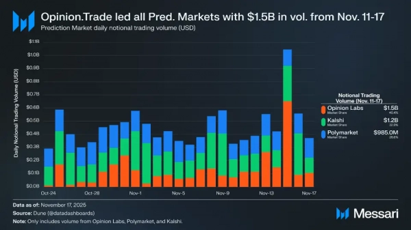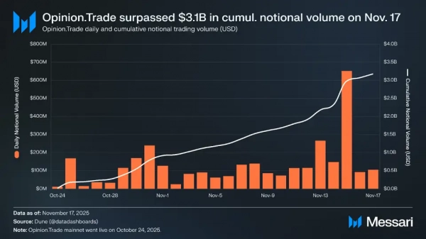 Согласно отчету Messari, по состоянию на 17 ноября совокупный торговый объем на платформе Opinion.Trade превысил $3.1 млрд. Открытый интерес достиг $60.9 млн, что, по оценке аналитиков Messari, стало третьим результатом в индустрии, уступая только платформам Kalshi и Polymarket.