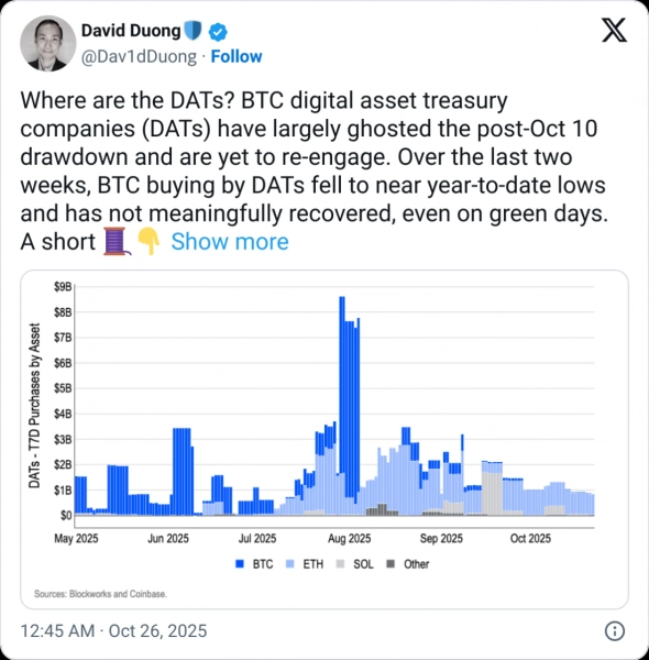 Компании, покупающие биткоины, «в значительной степени пережили падение после 10 октября и еще не возобновили деятельность», – заявил в воскресенье Дэвид Дуонг, руководитель отдела глобальных инвестиционных исследований Coinbase Institutional.