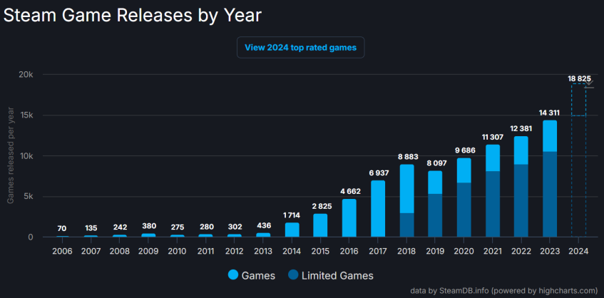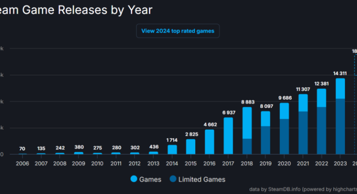 Цифровой магазин Valve продолжает бить собственные рекорды из года в год. Согласно данным со SteamDB, в 2024 году пользователи загрузили 18 825 видеоигр, что на 24 % больше по сравнению с предыдущим годом.