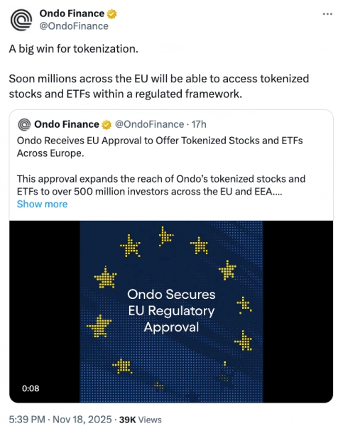 На сегодняшний день американская платформа токенизации Ondo Global Markets получила разрешение регулирующих органов на предложение токенизированных акций европейским инвесторам.