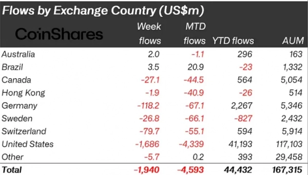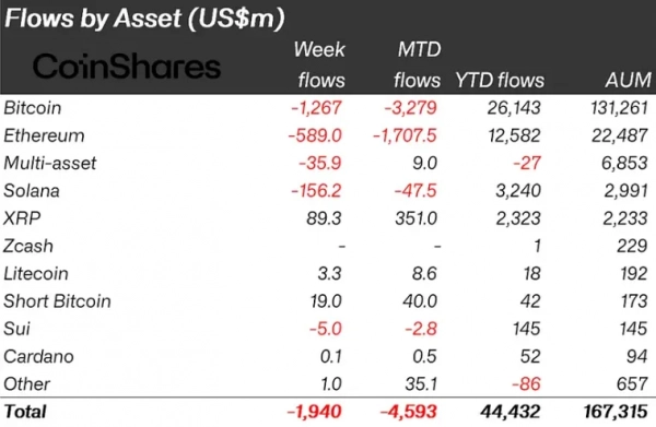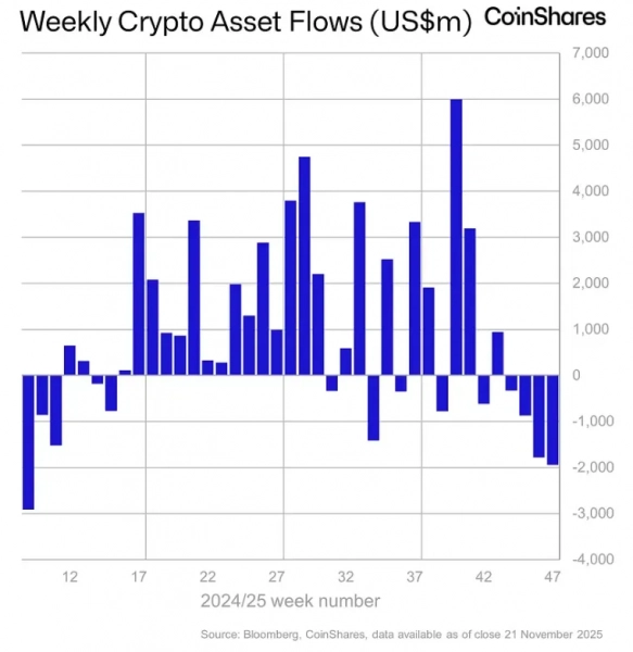 С 15 по 21 ноября отток средств из криптовалютных инвестиционных продуктов составил $1,94 млрд. Негативная тенденция сохраняется четвертую неделю подряд, говорится в отчете CoinShares.