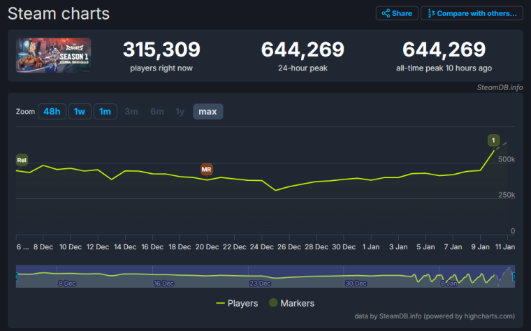 Теперь рекорд шутера в Steam — 644 269 человек. Такую высоту игра взяла спустя чуть больше месяца с момента релиза. По пиковому онлайну Marvel Rivals опередила  Apex Legends (624 473 человека) и  Path of Exile 2 (578 569 человек), но пока отстаёт от  Goose Goose Duck (702 845 человек) и  Baldur’s Gate III (875 343 человека).