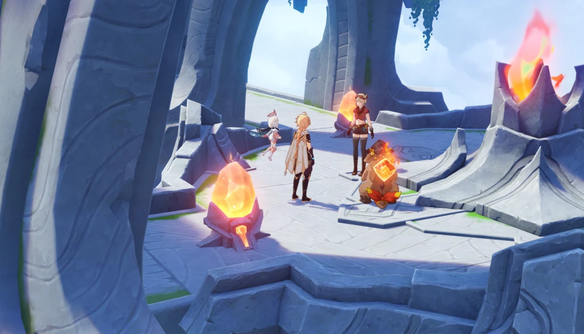 Для сбора первого огненного камня, расположенного на северо-восточном парящем острове, пройдите по мосту справа от алтаря, который находится напротив от Боны (смотрите скриншот ниже), а затем поднимитесь на подъемнике вверх.