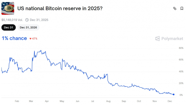 К 8 декабря объем ставок по прогнозу о крипторезерве достиг $5,15 млн. Шансы на создание его в этом году оцениваются теперь в 1% — токен «да» стоит всего $0,01. От максимума в марте он подешевел на 98%. Месяц назад были запущены параллельные ставки «Национальный биткоин-резерв США до 2027-го?», но объемы этого рынка пока минимальны.