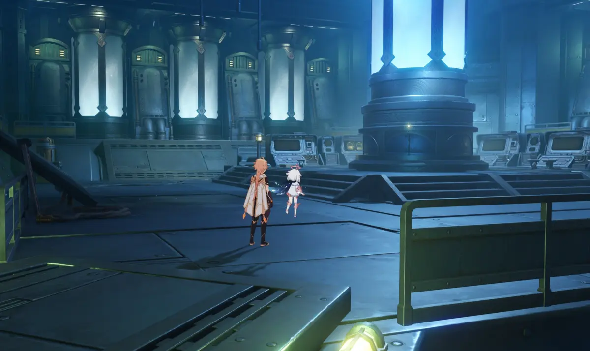 Войдите внутрь сооружения, пройдите еще дальше, послушайте Паймон, а потом спрыгните в шахту лифта. Прямо перед собой вы обнаружите барьер. Для его открытия необходимо сначала забраться на ящик справа, а потом навести камеру на карточку доступа и притянуть ее к себе (клавиша «Т»). Затем снова спуститесь и пройдите мимо двух замков на щите, чтобы разблокировать их.