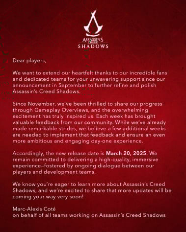 Мы убеждены, что существует несколько потенциальных способов повысить ценность активов и франшиз Ubisoft. Кроме того, мы все поддерживаем усилия наших команд по созданию самого амбициозного опуса Assassin’s Creed во франшизе. Поэтому мы приняли решение выделить дополнительный месяц на разработку Shadows, чтобы лучше учесть отзывы игроков, собранные за последние три месяца. Это позволит нам в полной мере раскрыть потенциал игры и завершить финансовый год на высокой ноте.