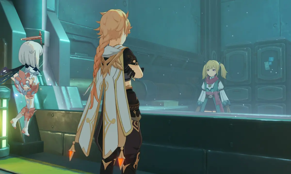 Поднявшись наверх, вы увидите впереди консоль, рядом с которой стоят два работника Фатуи. Подойдите к ним для запуска кат-сцены, в которой вы увидите, как птица залетела в контейнер. Взаимодействуйте с терминалом, вызовите второй ящик и заберитесь в него для старта задания.