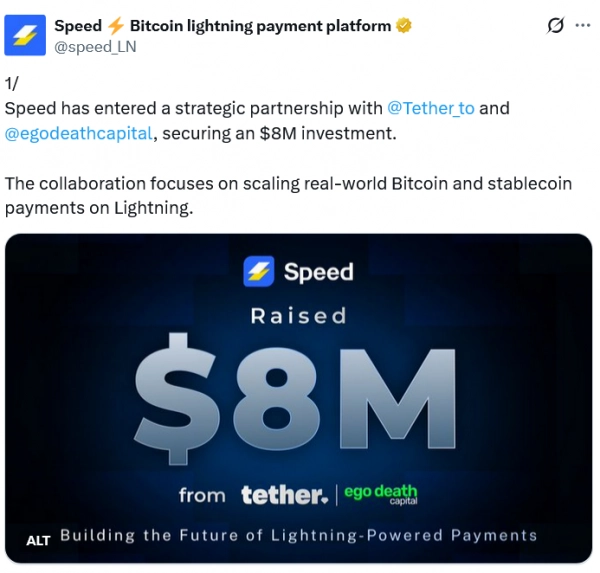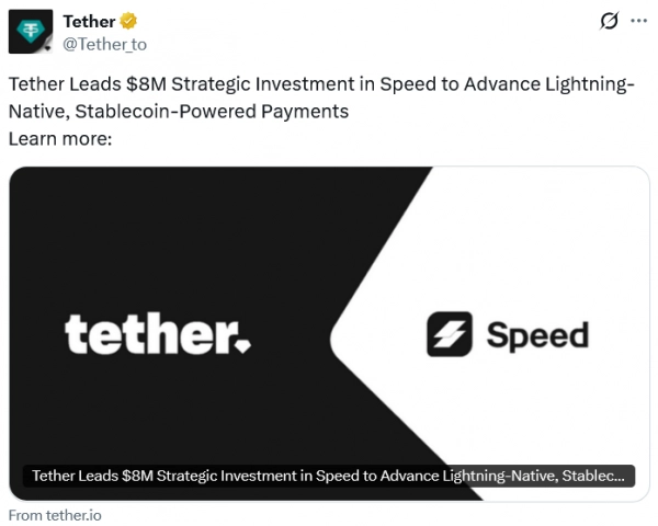 Гигант рынка стейблкоинов Tether возглавил инвестиционный раунд объемом $8 млн в биткоин‑стартап Speed. Цель — поддержать развитие корпоративных платежей в стейблкоинах через сеть второго уровня биткоина Lightning Network.