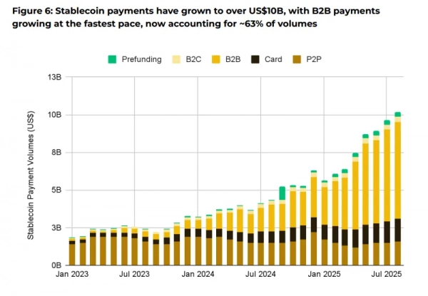 Согласно данным аналитической компании Artemis, общий объем платежей в стейблкоинах с начала 2023 года увеличился в 5,4 раза, превысив $10 млрд. На долю B2B-сегмента приходится около 63% этой суммы.
