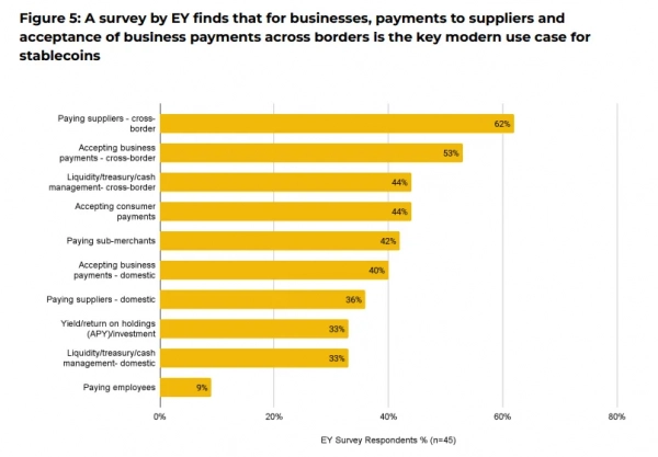 Выводы подтверждает опрос Ernst and Young за сентябрь 2025 года: 62% респондентов использовали этот класс активов для трансграничных расчетов с поставщиками, а 53% — для приема платежей от бизнес-партнеров.
