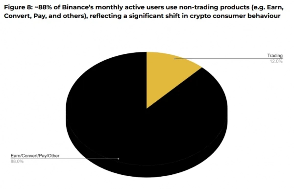 Тренд на утилитарное использование отражается в поведении пользователей. По данным Binance, 88% ежемесячно активных клиентов биржи применяют неторговые продукты, такие как Earn, Pay и Convert. Только 12% активно занимаются трейдингом.