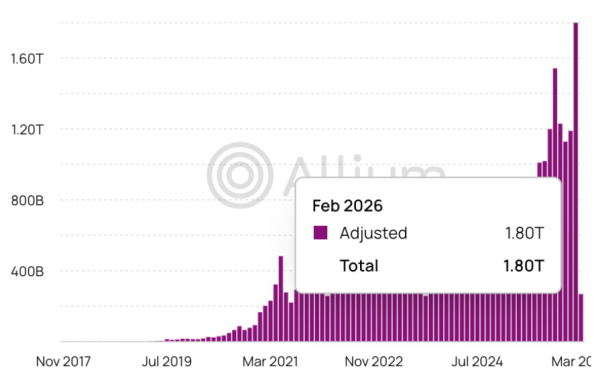 Согласно данным Allium, в феврале объём транзакций в стейблкоинах достиг рекордных $1,8 трлн.