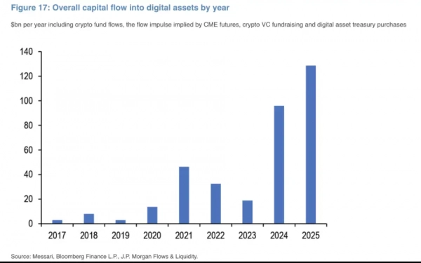 В 2025 году объем вложений достиг рекордных $130 млрд, что примерно на треть превышает показатель 2024-го. Основным драйвером роста в 2025-м в JPMorgan назвали приток средств в ETF на биткоин и эфир. По оценке аналитиков, деньги поступали в основном от розничных инвесторов. Существенный вклад также внесли покупки биткоина компаниями из категории DAT (Digital Asset Treasury — «казначейства цифровых активов», то есть те компании, которые формируют резерв из криптовалют), помимо Strategy. А вот активность корпоративных инвесторов и хедж‑фондов через фьючерсы CME на биткоин и эфир заметно снизилась по сравнению с 2024 годом.