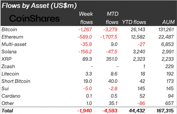 Инвестиционные продукты на базе цифровых активов зафиксировали чистый отток средств в размере 1,94 млрд $ по итогам прошлой недели. Это третья по величине серия выводов капитала с 2018 года. На этом негативном фоне XRP стал единственным крупным активом, показавшим положительную динамику.