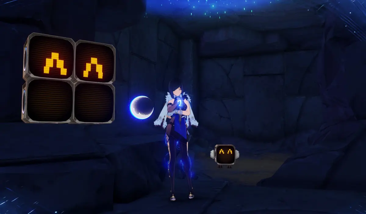 Переместитесь к юго-восточному телепорту указанной области, а затем спрыгните с обрыва и начните планировать в восточном направлении и приземлитесь на утесе с постройкой. Приблизьтесь к летающему дрону, удерживающему бота, а затем начните следовать за ним. Спрыгните в пропасть и воспользуйтесь лунной тропой, чтобы продолжить преследование робота.
