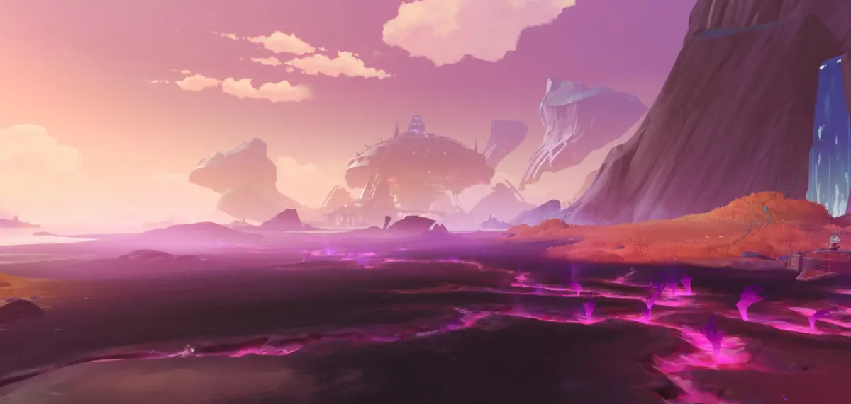 Помимо фей, в утечках показали виды новых зон. Одна из них, Остров Паха, измененный дикой охотой, поражает атмосферой: среди каменистой местности под ярким закатным небом возвышается гигантский древний механизм. В воде парят светящиеся фиолетовые силуэты, похожие на руки, создавая ощущение, что магия и технология здесь существуют в тесном симбиозе.