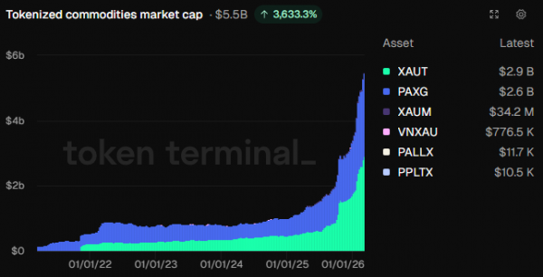 Совокупная стоимость токенизированных сырьевых товаров достигла $5,5 млрд, увеличившись на 3,633% с января 2022 года и почти в пять раз за последние двенадцать месяцев.
